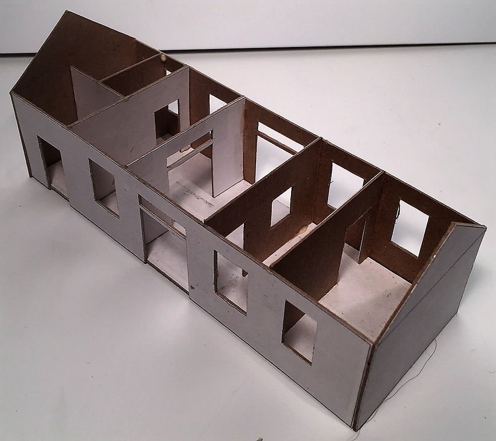 The kit will have three external finishes. One in red brick, one in stone and one in wood. The inside will be detailed as can be seen from the internal walls in the mock up.
